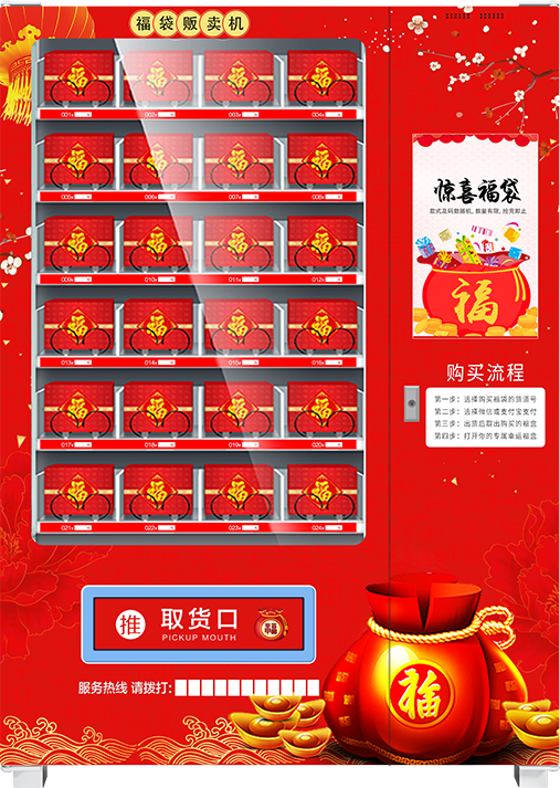 盛馬福袋機(jī)是一個(gè)創(chuàng)新的概念,機(jī)體類似自動(dòng)售貨機(jī),針對(duì)不同的創(chuàng)景擺放不同風(fēng)格的機(jī)器,機(jī)器內(nèi)分別是10元——100元價(jià)位不等的福袋,商品種類繁多,其中不定時(shí)會(huì)在福袋內(nèi)出現(xiàn)Iphone7、金條之類超高價(jià)值產(chǎn)品。福袋機(jī)內(nèi)的福袋都是統(tǒng)一大小的精美禮品盒,顧客付款后福袋會(huì)自動(dòng)從貨架上降落到福袋出口,用戶可以直接取走。