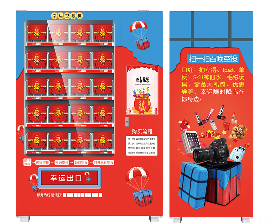 福袋機是一個創新的概念,機體類似于自動販售機,針對不同的場景擺放不同風格的機器,機器內分別是10元-100元價值不等的福袋,商品種類繁多。福袋機內的福袋都是統一大小的精美禮品盒,顧客付款后福袋會自動從貨架上降落到福袋出口,用戶可以直接取走。